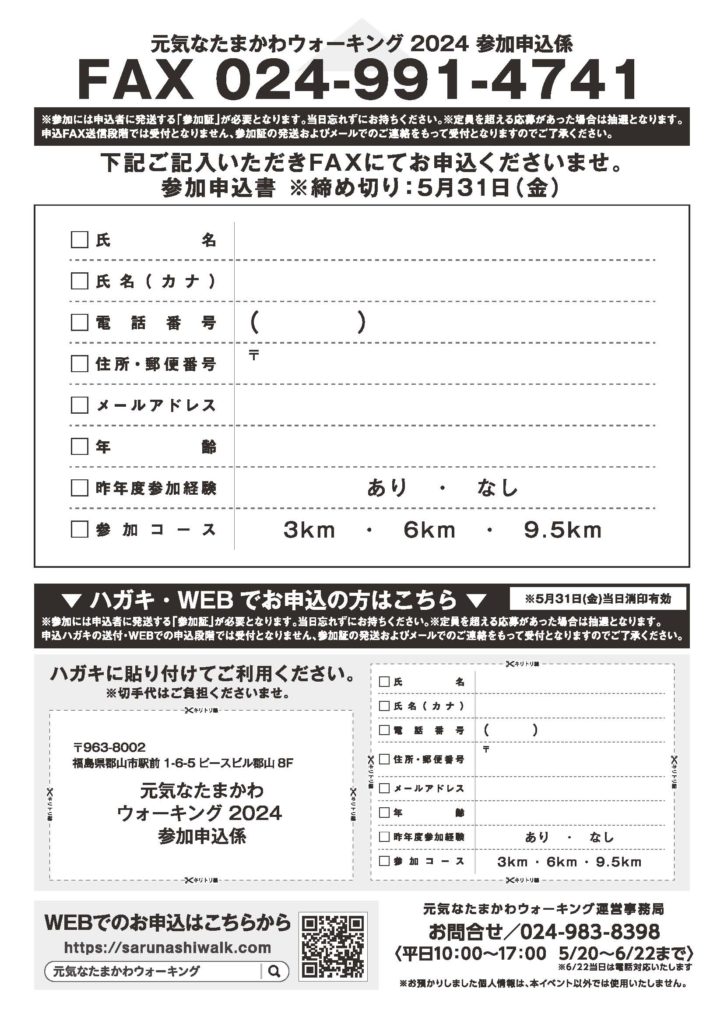 イベント開催 お知らせ 玉川村 元気なたまかわウォーキング2024,玉川村、NPO法人たまかわ元気スポーツクラブ、 元気なたまかわウォーキング2024(6/22(土))参加者募集! 2024年5月20日 2024年5月31日 mazasse_staff ※募集は終了しています。 元気なたまかわウォーキング2024の参加者を募集しています。お申し込みは、5/20(月)~5/31(金)まで。応募方法は、特設サイト、ハガキ、FAXとなっています。詳細は、チラシをご覧ください。 お問合せ:元気なたまかわウォーキング運営事務局(電話:024-983-8398) Facebook Twitter