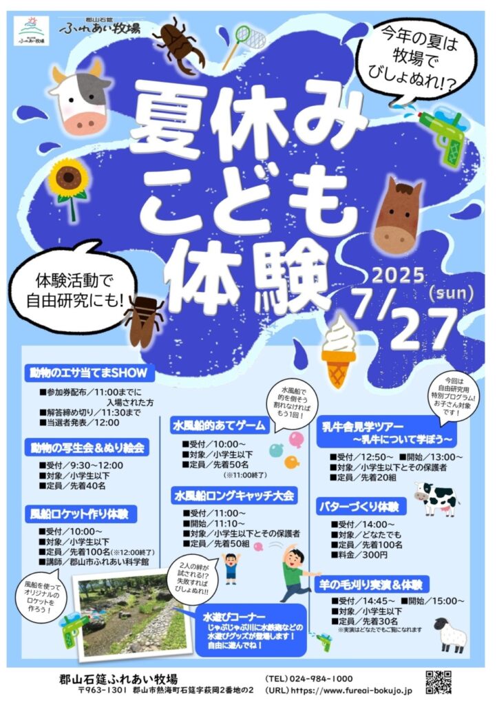イベント開催 お知らせ 郡山エリア 郡山市、郡山石筵ふれあい牧場、夏休みこども体験 郡山石筵ふれあい牧場・夏休みこども体験◆7月27日(日) 2025年7月9日 2025年7月30日 mazasse_staff 郡山石筵ふれあい牧場での「夏休みこども体験」では、牧場で暮らす動物たちのエサ当てや、乳牛舎見学ツアーなど『学び』の要素を取り入れた体験が盛りだくさんです。 〇日時:2025年7月27日(日)9:30~16:30〇場所:郡山石筵ふれあい牧場(郡山市熱海町石筵字萩岡2-2)〇施設利用料金:一般(大人)300円 、小・中学生 150円〈お問合せ〉郡山石筵ふれあい牧場 (電話:024-984-1000) Facebook Twitter
