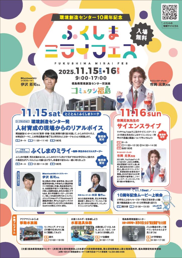 開所から10年が経過することから、これまで環境創造センターが実施してきた教育・研修・交流やモニタリング等に関する取組の成果を発信するとともに、これからの本県の復興・再生を担う若者世代の意見を踏まえ、一人ひとりがふくしまのミライのためにできることを考えるイベントを開催いたします!