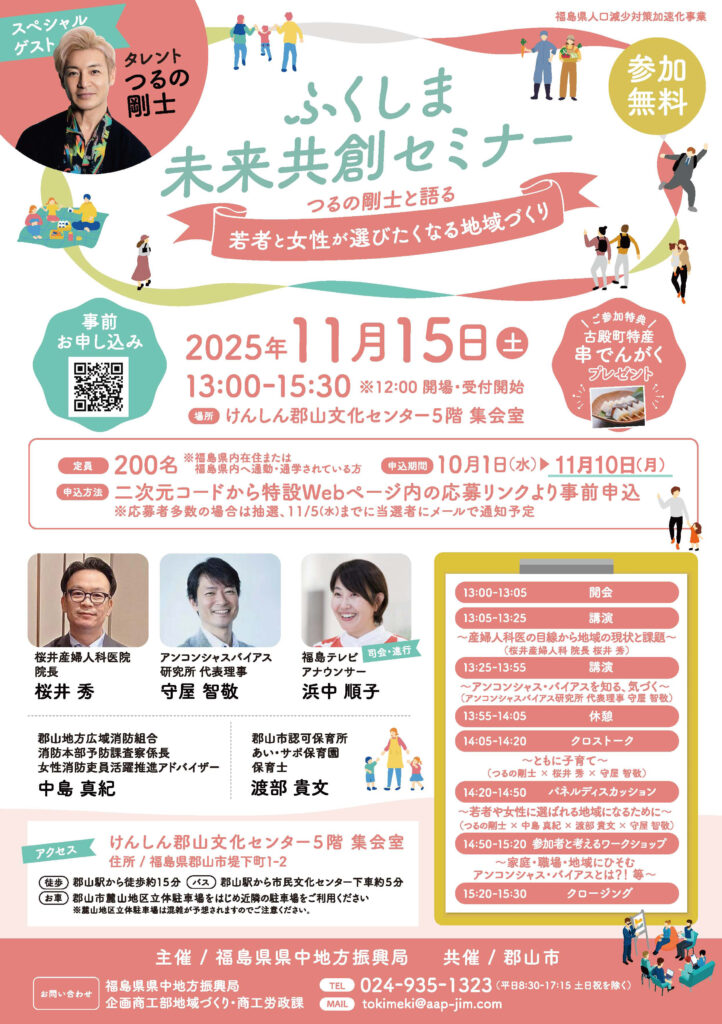 家庭・職場・地域における固定的性別役割分担意識とそこにひそむアンコンシャス・バイアス(無意識への思い込み)への気づきや、一人一人ができることをゲストと共に考える県民参加型のセミナーを開催します。ご参加の方には「古殿町特産の串でんがく」をプレゼント!