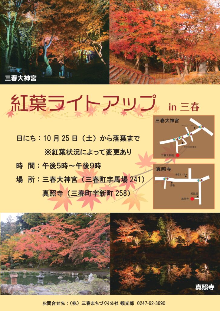 イベント開催 お知らせ 三春町 田村エリア 三春町、紅葉ライトアップ、 紅葉ライトアップin三春◆10月25日(土)から 2025年11月6日 2025年11月9日 mazasse_staff 三春大神宮、真照寺の紅葉がライトアップされます。艶やかな紅葉を、是非ご堪能ください。 期間:2025年10月25日(土)から落葉まで時間:17:00~21:00場所:三春大神宮(三春町字馬場241)、真照寺(三春町字新町258)お問合わせ:㈱三春まちづくり公社 観光部(TEL:0247-62-3690) Facebook Twitter