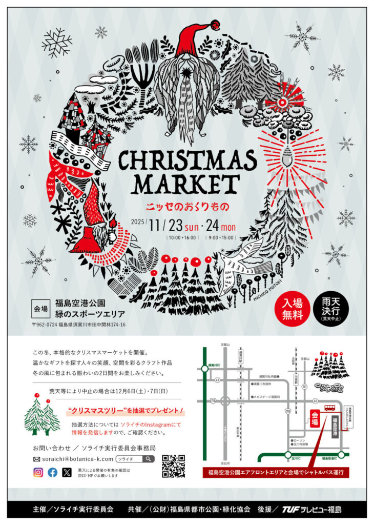 福島空港公園 緑のスポーツエリア にて「クリスマスマーケット ニッセのおくりもの」が開催されます。