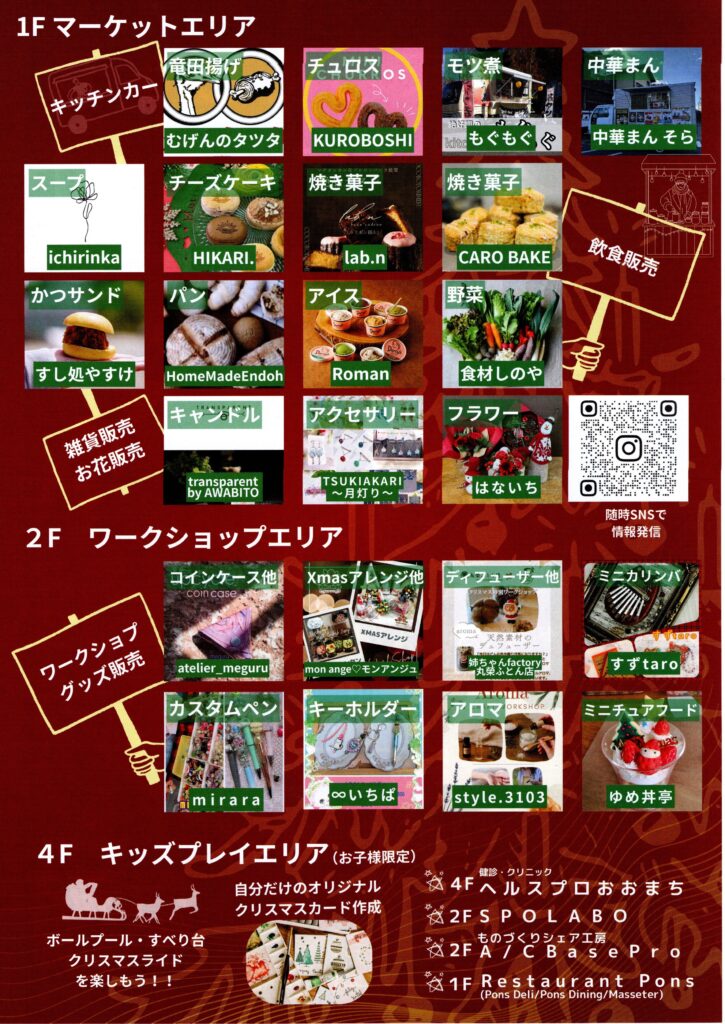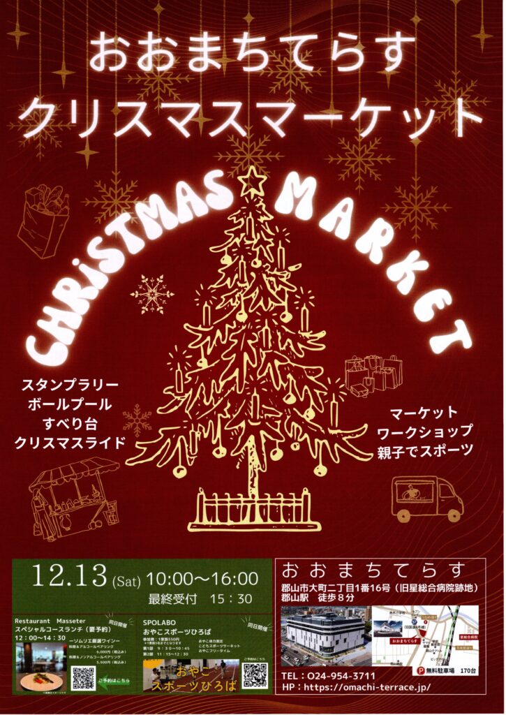 イベント開催 お知らせ 郡山エリア 郡山まちなか 郡山市、おおまちてらす、クリスマスマーケット おおまちてらすクリスマスマーケット◆12月13日(土) 2025年12月1日 2025年12月13日 mazasse_staff 郡山市大町のおおまちてらすにて、「おおまちてらすクリスマスマーケット」を開催します。マーケットエリア、ワークショップエリア、キッズプレイエリアで、お楽しみください。 〇日時:2025年12月13日(土) 10:00~16:00〇場所:おおまちてらす(郡山市大町2丁目1-16)(駐車場は、おおまちてらす大駐車場をご利用ください。) Facebook Twitter