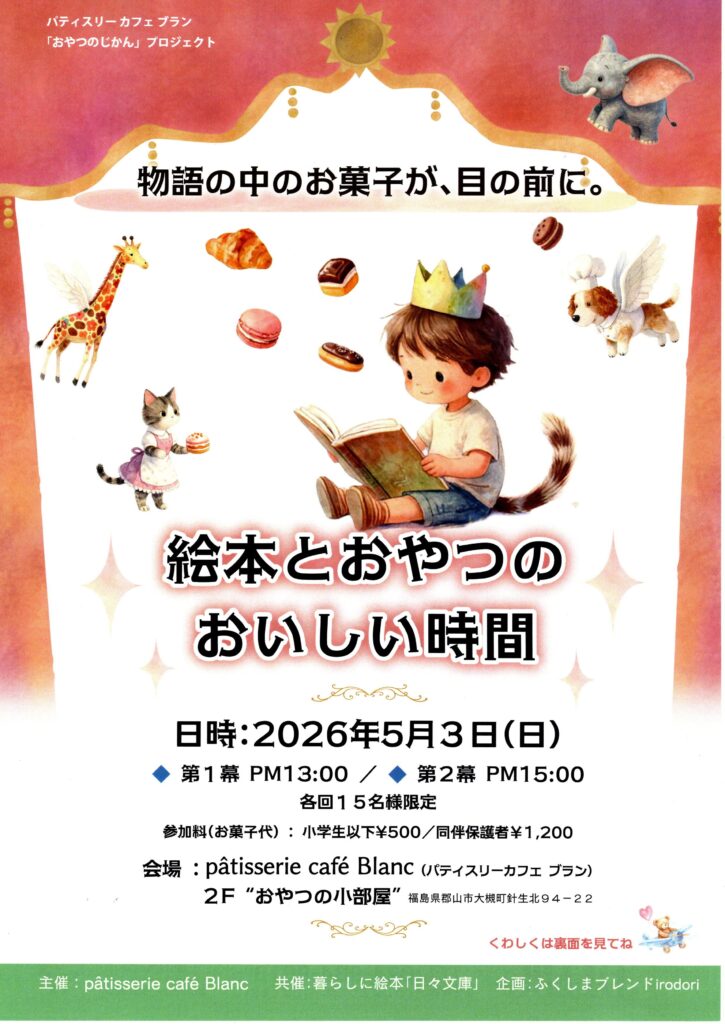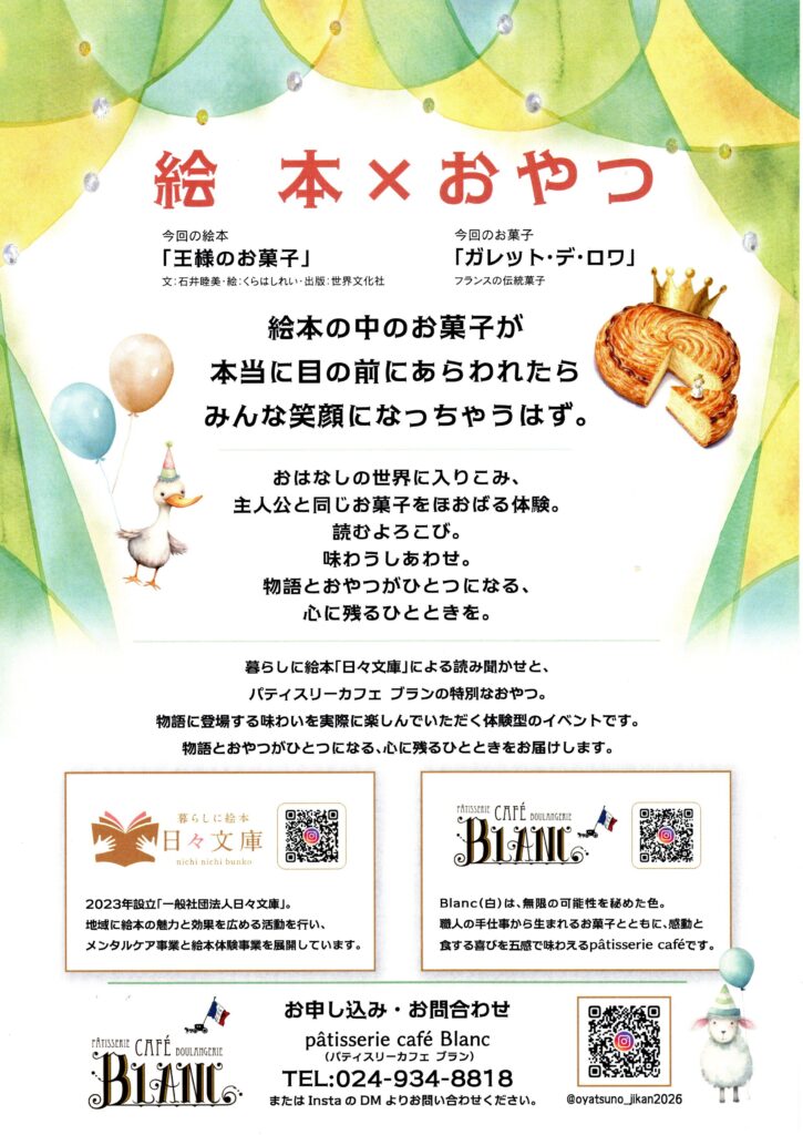 お申し込みは、下記チラシのQRコード、またはパティスリーカフェブラン(電話024-934-8818)へ。