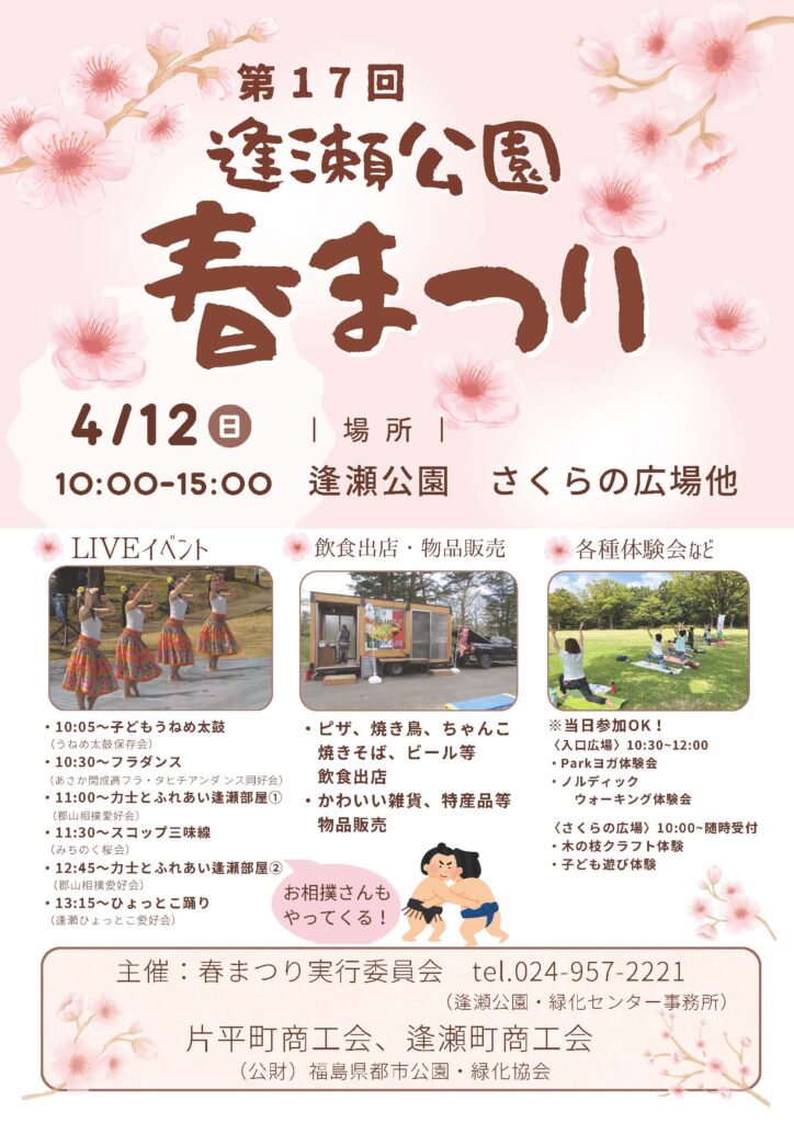 イベント開催 お知らせ 郡山エリア 郡山市、逢瀬公園、春まつり 逢瀬公園春まつり◆4月12日(日) 2026年4月10日 2026年4月10日 mazasse_staff 逢瀬公園にて「逢瀬公園春まつり」が開催されます。子どもうねめ太鼓やフラダンス、ひょっとこ踊り、販売コーナーや体験コーナーなど、イベント盛り沢山なお祭りです。 〇開催日 2026年4月12日(日)〇開催時間 10:00~15:00〇開催場所 逢瀬公園 さくらの広場(郡山市逢瀬町河内西長倉1-3) Facebook Twitter